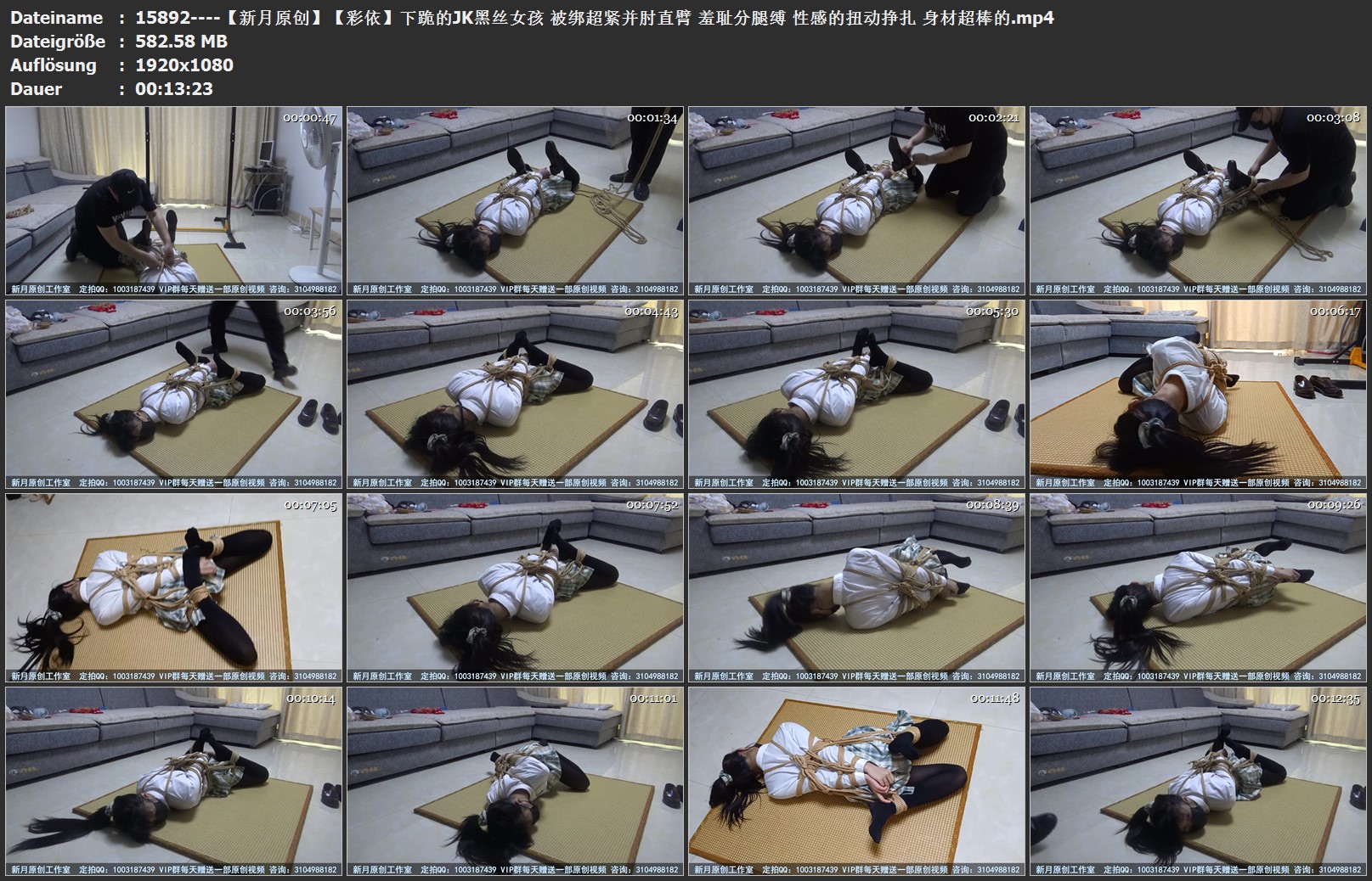 元气满满的彩依妹妹,被月老狗骗绑了超紧直臂,跪坐在地上。可是月老狗并没有打算放过她,这才仅仅是开始~接着把彩依妹妹双腿分开,折腿捆绑起来,一个超级羞耻的姿势。捆绑好之后月老狗就离开了,留下彩依妹妹独自挣扎。彩依的挣扎也是非常给力,性感的黑丝,羞耻的姿势,不停的扭动着身体,十分有感觉~身材太棒了!!