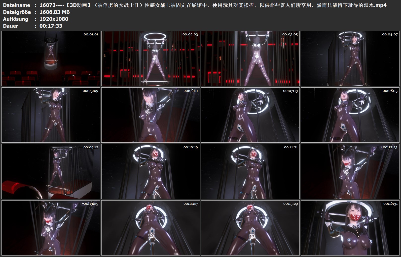 【3D动画】(被俘虏的女战士Ⅱ)性感女战士被固定在展馆中,使用玩具对其揉捏,以供那些富人们所享用,然而只能留下耻辱的泪水