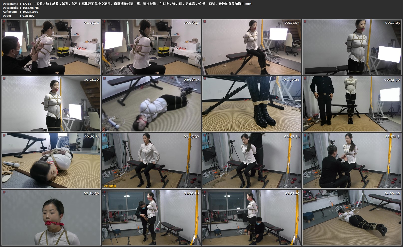 【绳之韵】够软、够紧,够劲!高挑靓丽美少女羽灵,瘦腿裤绳戏第一集,漆皮长靴,白衬衣、弹力裤、后观音、蛇 缚、口球,曼妙的身段和挣扎
