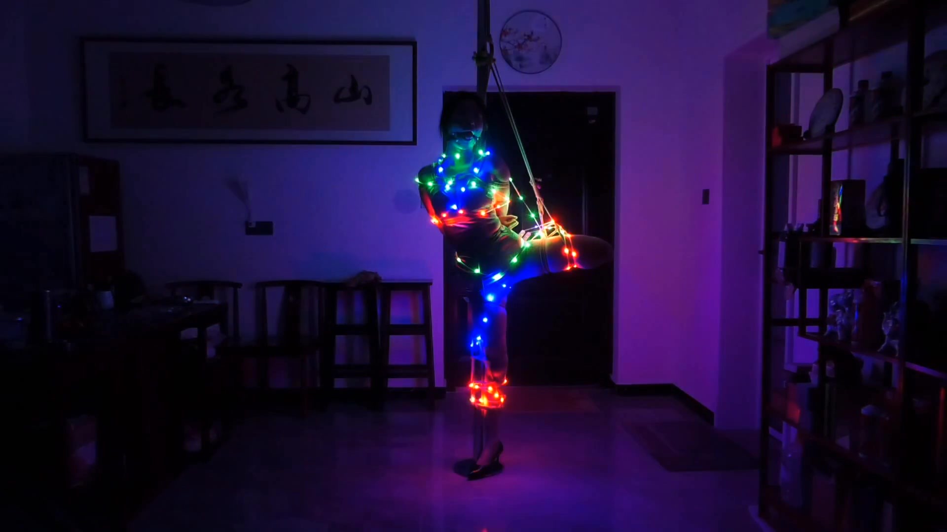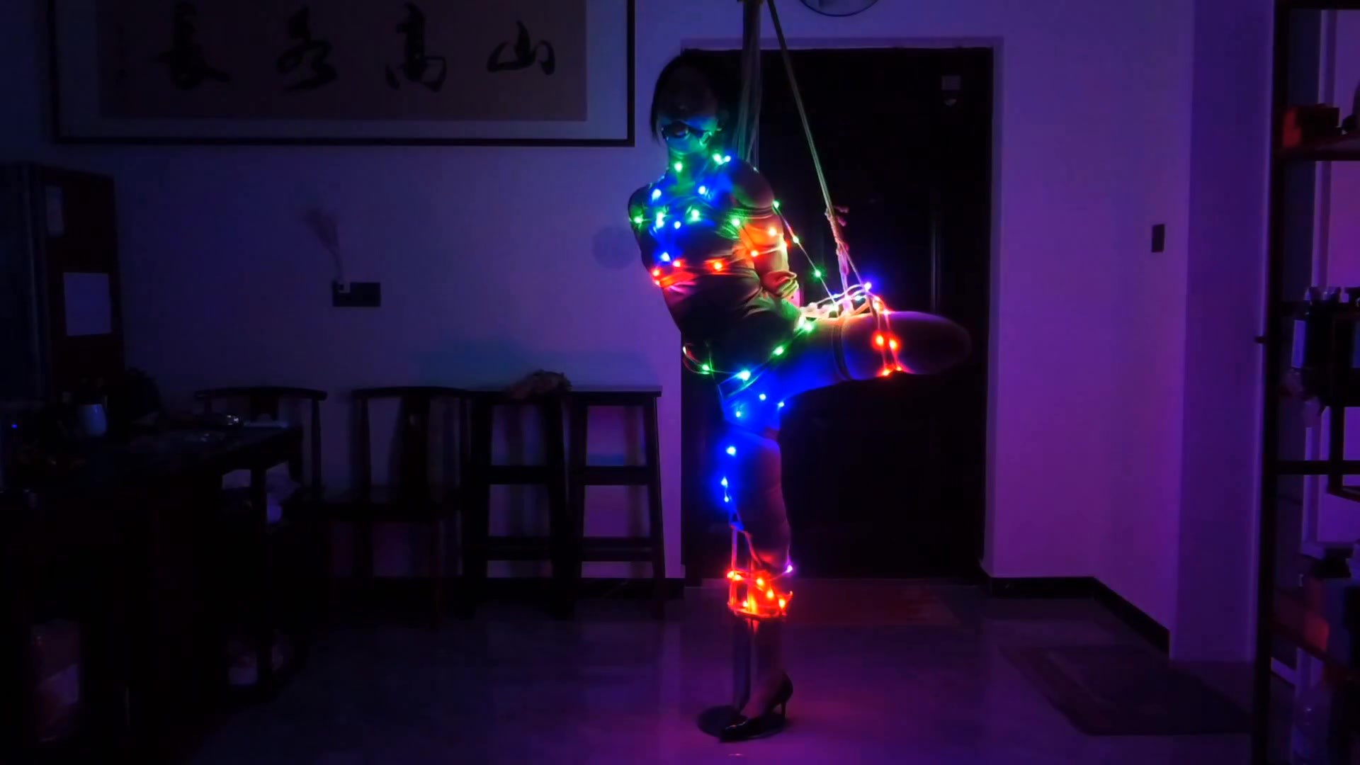 把女M戴上口球,单腿吊缚在钢管舞台,全身缠满霓虹灯照亮整个舞台,细高跟单腿站立放置!