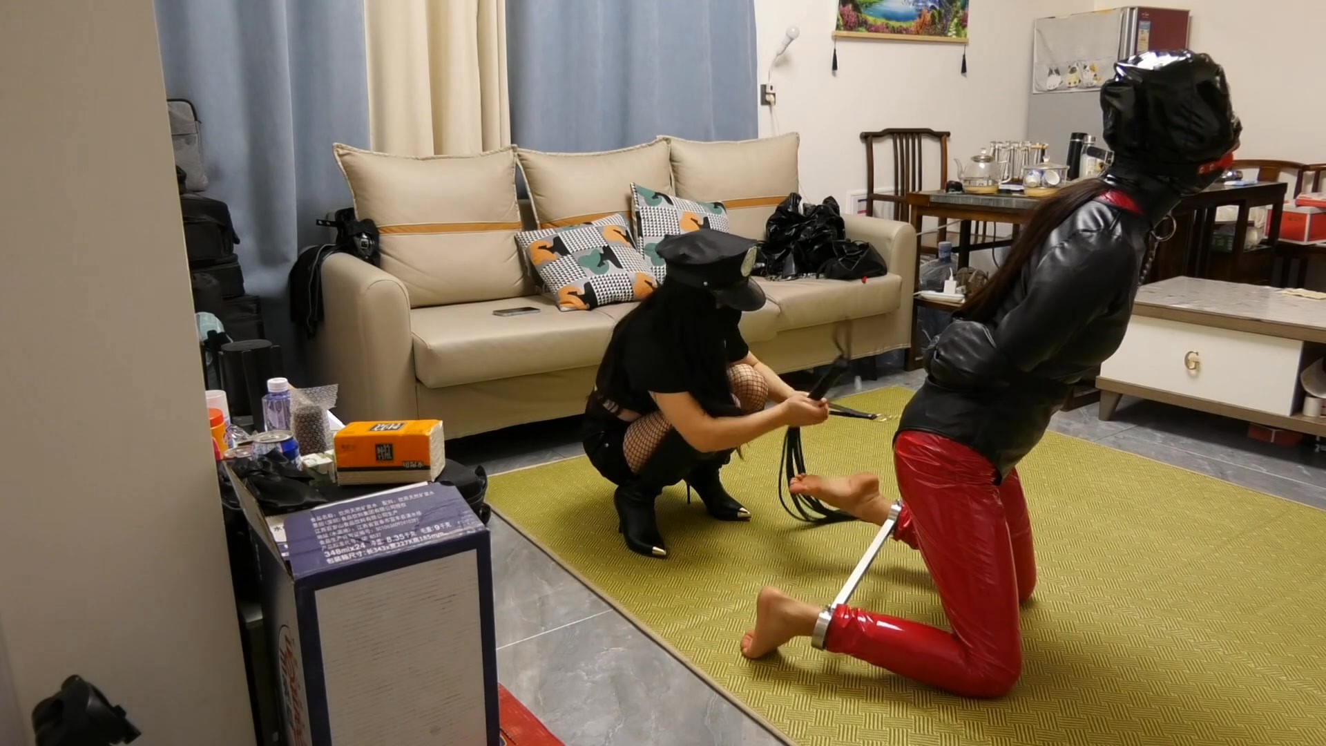 感胶衣女王在家收拾TJ不听话的女M,女M被穿上胶衣拘束衣,戴上头套,超大口球,被束缚着,双脚戴着固定镣铐限制着大幅度活动,看性感女王怎么收拾这个不听话女M