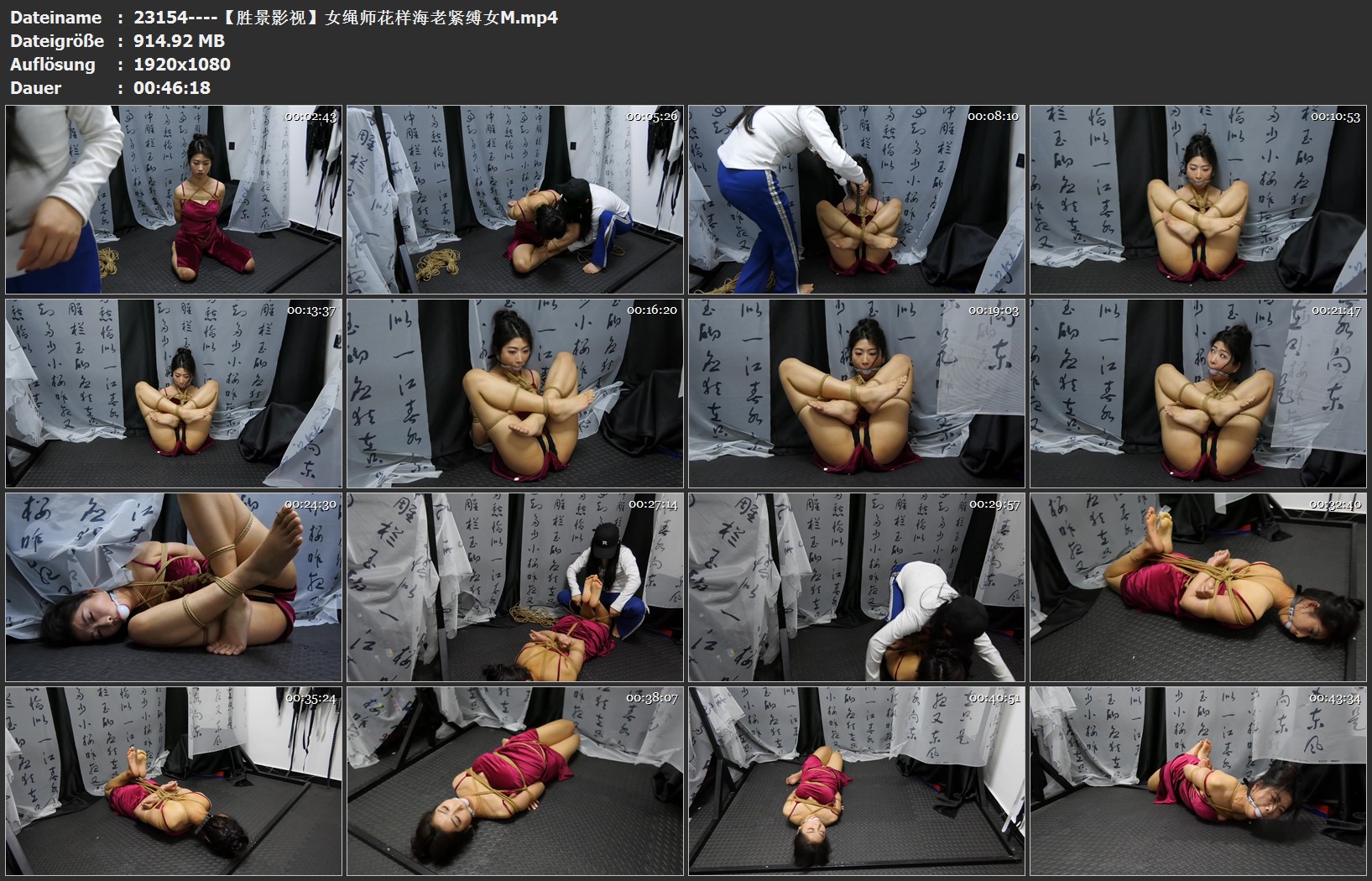 女M被女绳师花样海老缚紧缚以及驷马紧缚,放置在地上动弹不得,加上口球堵嘴,非常痛苦