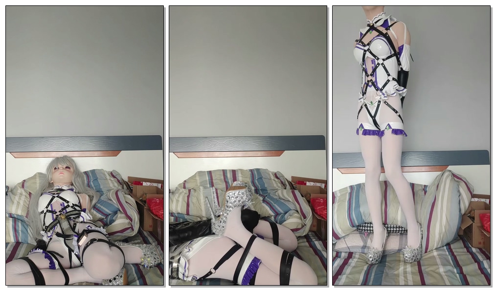 艾米莉亚兔女郎的cosplay+kig头壳自缚,穿上恨天高,腿上再绑上郊狼点击器,电击贴片贴在了大腿内侧持续刺激,后面也cha入了电击g塞贞cao带,绑好之后电击+紧缚+[X_X]的感觉实在是太棒了