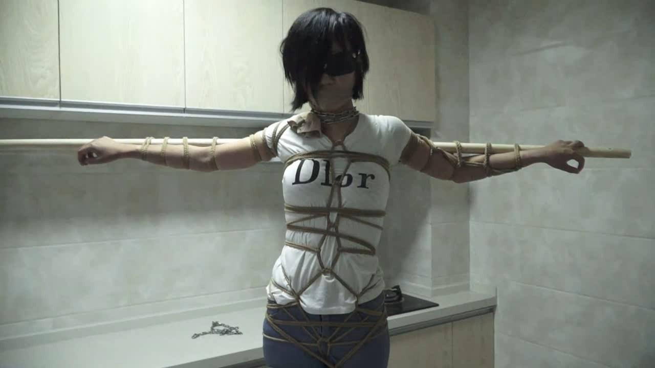 小欣被丈夫抱进了卧室,换上了他们第一次见面时的衣服,又被紧紧捆绑起来。等到小欣再醒来时,她已经被绑在一根木柱前,全身被绑好龟甲缚,双脚、膝部、腰部和胸部处都被捆在柱子上,脖子也被铁链缠住,。双臂被横着绑在一根木棍上,整个身子呈十字状。蒙眼的黑布和堵嘴依旧没有解开。