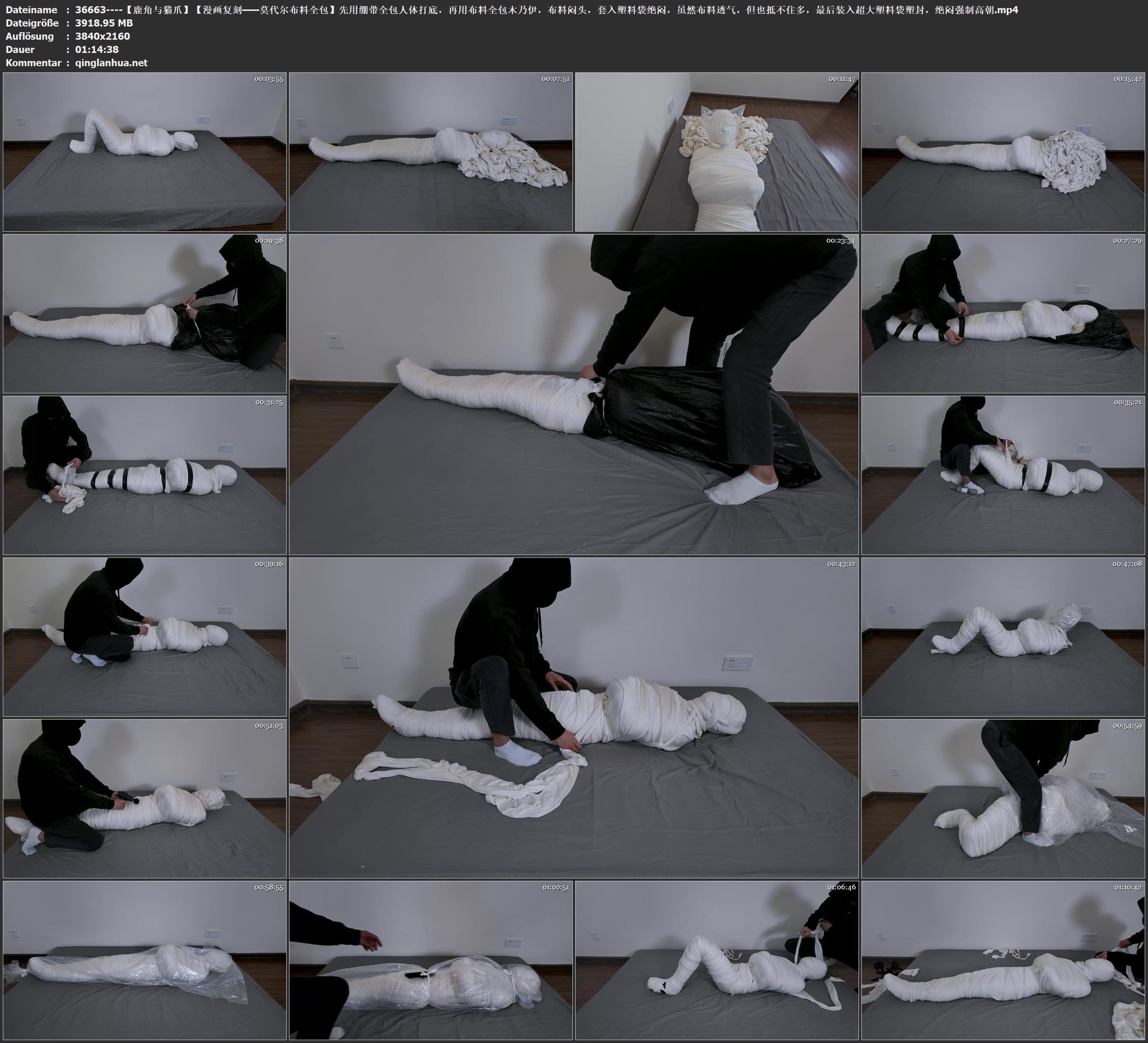 •复刻的漫画在P3/4,不完全复刻出来,加了一些绝闷的玩法,首先用绷带对爪爪的身体全方位包裹,手放前面固定。再用莫代尔布料进行木乃伊全包,玩到一半再用PVC胶带加固,接着再包裹布料增加厚度,最后再用等身塑料袋塑封起来,封死口子,空气只能在爪爪的身体内循环了。